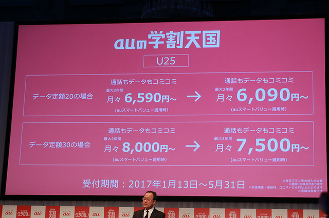 HOME > ニュース > モバイル/PCニュース 松田翔太さん、桐谷健太さんも登場 au、2017年春のメインは“スマホ以外”。LTE対応ストレージやタフネスガラケー、新プラン「学割天国」などアピール 編集部:小澤 麻実 2017年01月11日 前の写真へ 25歳以下向けのプランも用意 前の写真へ この写真の記事へ 関連リンク au 2017年春モデル詳細 au