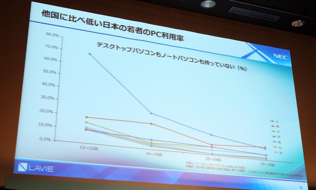 HOME > ニュース > モバイル/PCニュース 気軽に持ち運べる“キャンパスモバイルデザイン” NEC、更に軽くなった“世界最軽量”13.3型2in1ノートPC「LAVIE Hybrid ZERO」 編集部:押野 由宇 2017年02月07日 前の写真へ 次の写真へ 日本の若年層のPC利用率 前の写真へ 次の写真へ この写真の記事へ 関連リンク LAVIE Hybrid ZEROの詳細 LAVIE Note Mobileの詳細 LAVIEブランドサイト