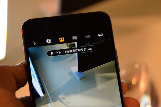 ポートレートモードに切り替えるアイコンは画面トップに配置。美肌モードなど撮影効果も楽しめる