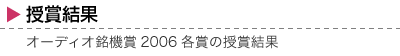 | このページでは『オーディオ銘機賞 2006』の選考結果を日本語版と英語版で掲載しています。 This Page "2006 AUDIO EXCELLENCE AWARDS" contain the selection committees report in both English & Japanese with the result. |