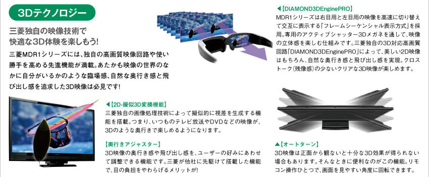3D対応ブルーレイレコーダーとHDDを内蔵した、オールインワン型の3D録画テレビ。それが三菱電機「REAL」MDR1シリーズです。テレビだけで完結するシンプルな構成なので、使い勝手が抜群で、配線もすっきり。さらに三菱独自のテクノロジーで高画質・高音質を実現しています。ハイグレードな3Dライフを手軽に満喫したいなら、この1台で決まりです!