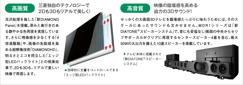 光沢パネルによる艶やかで美しい映像もさることながら、音のよさも特筆。薄型テレビは音が痩せがちですが、「新DIATONERスピーカーシステム」によって、重低音までしっかり再現。セリフも聴きとりやすく、広がり感が得られるサラウンド機能も搭載していて、3D映像の臨場感を高めてくれます。