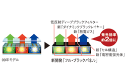 VIERAのVT2シリーズはプラズマテレビの進化過程のなかで特に重要な位置を占める製品だ。「フル・ブラックパネル」では発光効率の向上という最重要課題を高次元でクリアしつつ、予備放電の副作用を排除することによって黒の締まりと高輝度を両立。プラズマ史上最良の高コントラスト映像を実現した。さらに、そうした基本画質の向上をベースに初の3D対応を果たしたことで、VT2シリーズはテレビ市場全体を強力に刺激し、活性化するとともに、きわめて高い評価を獲得したのである。