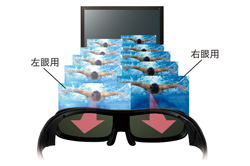 | パナソニック独自の高発光効率化技術により、従来より性能が2倍に向上。フル・ブラックパネルの搭載と併せて、映像の基本となる黒の再現力が高まった | 左眼用と右眼用の映像をそれぞれ1秒間に60コマずつ、合計120コマを高速に再生する。専用3Dメガネを用いてかつてない臨場感を楽しみたい |