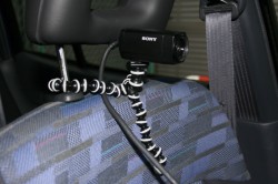 このJOBYゴリラポッドを使うと、自動車内のいろいろなところで固定することもできるし、戸外で金網などに固定することも、いとも簡単にできる。ただし、ダッシュボードには固定できないため、走行中の道路などを撮影したい場合、やや画が遠くなってしまうのが難点だ。このような目的ではダッシュボードに固定できるツールを使ったほうがいいようだ。