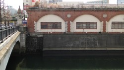 テスト撮影を行ったのは下記写真の場所。石製の欄干の前に立ち、横に長く続くレンガ作りの建物がどこまで写せるかを試した。まずはパノラマ機能を使わず通常のサイズで撮影したものが下記右側の写真。部屋がふたつと半分映っている状態だ。