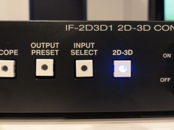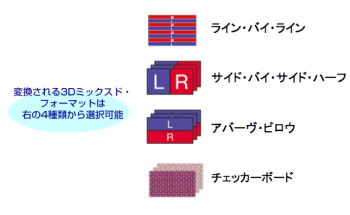 実際の操作は非常に簡単で、本体の2D-3Dボタンを押すだけで3D変換画像が得られ、出力はL/R独立のほか、計4種類の3Dフォーマット(ライン・バイ・ライン、サイド・バイ・サイド・ハーフ、アバーヴ・ビロウ、チェッカーボード)から選ぶことができる。