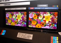 特筆すべき点は従来、RGB LEDバックライトの時などに指摘されていた、過剰な広色域で不自然さを覚えるような映像ではなく(かつては赤に力を入れた結果、肌色の調整に苦労していたものが多かった)、より自然な映像表現を実現していることにある。デモ映像の展示がひまわりの花のイエローと南国のエメラルドグリーンの海などシアン方向の再現性に力を入れており、他にも紫やオレンジなどの色も力強さを増している。ただし「デモ機は米国モデルであり、日本とはユーザーの色の好みも異なるため、国内ではこのまま発売するわけではない」(説明員)とのことだ。