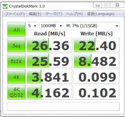 試しに転送速度を計測できるフリーソフト「Crystal Disk Mark」を使って転送の実効速度(シーケンシャルリード)を計測してみると、SDDR-199はメモリーカードの性能をほぼ引き出す26.36MB/sを達成したが、DELL製PCでは18.99MB/sにとどまった。カードリーダーとして性能差はここでも証明された格好だ。