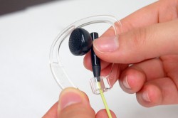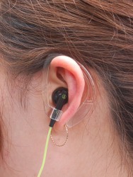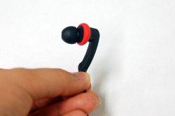ATH-CKP300はコードが邪魔にならないよう、ブッシュを後方に傾けた“リアアングルドブッシング”設計によって、走ってもケーブルが顔にピシピシあたらないよう配慮されています。楕円型ラバーリングのおかげか、耳にぴったりはまるので、思ったより外れにくいです。