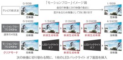 3D表示に際しては、左右同じコマを二度書きするとともに、二度書き目の映像表示時に輝度を高めてバックライトを点灯。専用メガネの開閉タイミングとシンクロさせ、二度書きされたコマのみを見えるようにすることで、残像感を低減させるという手法をとっている。