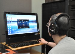 ヘッドホンによるサラウンド再生を試聴する筆者