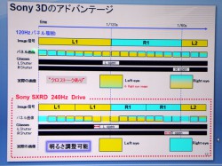 なお、3Dドライブ(表示)方法は、同社の液晶テレビ“BRAVIA”とほぼ共通の240Hzドライブの2度書き形式である。ただ、液晶テレビのようにLEDバックライトによる発光制御はできないため、アクティブシャッターメガネの開閉タイミングの制御をシビアに設計、左右それぞれの映像がきっちり描かれた瞬間を選んでシャッターを開けクロストークを細小に抑える工夫を図る。映像を2度書きさせる狙いは、なるべく早く1画面を描かせたいためである。