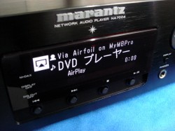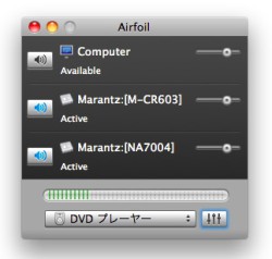 Mac OS X版AirFoil v3.5.4で試したところ、DVDプレーヤーやVLC(フリーのメディアプレーヤー)で無事に再生できることを確認した。AirFoilはシステムに出力する音声をジャックしてAirPlayに振り向けるため、再生時はパソコンから音は聴こえなくなるが、システムの警告音を含め、あらゆる音声をNA7004に出力できる。