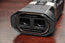ビクターの“Everio”「GS-TD1」は本格派のフルHD 3D動画撮影に対応したビデオカメラ。本体には暗闇でも光をくっきり捉えることができるF1.2という明るい「GTレンズ」を2基と、2つの高感度B.S.I. CMOSイメージセンサーを搭載している。黒を基調としながらシルバーのアクセントを配したボディは、やや大柄に見えるが、握ってみると実にしっくりとくる。指のかかりも良く、前後の重量バランスも絶妙で、撮影のための道具ならこの大きさが使いやすいと感じた。少し手が小さめな方でも大丈夫なサイズだと思う。