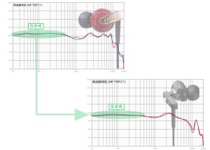 これは、バランスド・アーマチュア方式を聴き慣れたユーザーの一部から、初号機の低音があまりに充実し過ぎでは、という指摘があったことに応えたかたちだ。実際の測定でも、弐号機の周波数特性はバランスド・アーマチュア方式、しかもトリプル・ドライバー構成のハイエンド製品に近いフラットなものだという。