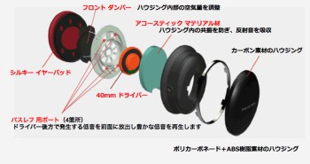 本機はハウジングの素材に大きな特徴を持っている。イヤーカップの部分はカーボングラファイトファイバー、メインのエンクロージャーはポリカーボネートにABS樹脂と、それぞれに強度の高い異種素材を組み合わせることで、振動をより効果的に抑え込むつくりとしている。