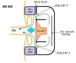そのハウジング内にはアコースティック・マテリアル材と呼ばれるパーツが仕込まれており、これもハウジング内の共振を防ぎ、反射音を抑制する効果を持っているという。さらにバスレフ構造を採用し、ドライバー後方に発生する低音を位相調整したうえでポートから前面に放出し、低音を強める。