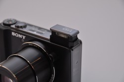 本体を手に取ってみると、煩わしく感じるような重さでは全くないが、多くの機能を詰め込んだことが実感される、ズシリとした手応えがある。レンズのズーム倍率がHX5Vの10倍から、本機では16倍に拡大されたこともあり、本体奥行き寸法はHX5Vが28.9mmであったのに対して、HX9Vでは33.9mmと深くなっている。バッテリー込みの本体質量はHX5Vの約200gから、HX9Vで約245gになっている。新たにポップアップ・フラッシュを内蔵した点など、メカニカルなギミックは、特に男性カメラファンの購買欲をくすぐるポイントになりそうだ。