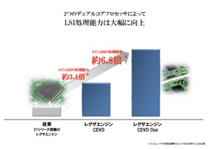 本村氏:「ZG2」シリーズには、最新の映像エンジン「レグザエンジン CEVO Duo」が採用されています。「CEVO」という名前には“CELL EVOLUTION”という意味が込められていて、従来の「CELLレグザエンジン」の思想がそこに継承されながら、進化しています。CELLレグザでは、Cell Boradband Engineとソフトウェアの強力なパフォーマンスによって、高画質とタイムシフトマシン録画などの高機能を実現していました。「CEVO」は、東芝が新しくテレビ専用に開発したプロセッサーです。CEVOではCELLレグザがソフトウェアベースで行っていた処理の負担を軽減して、ハードウェアベースの処理に分散させたことで、エンジン全体の処理能力が高められています。さらに、ZG2シリーズでは「レグザエンジン CEVO」のメインLSIを2基搭載することで、画質だけでなく、大幅な録画機能の向上が実現できたのです。