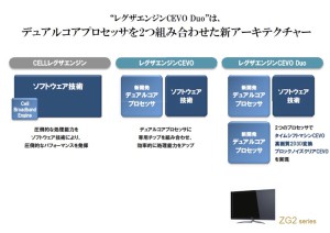 「CELLレグザエンジン」と「レグザエンジン CEVO」、「レグザエンジン CEVO Duo」それぞれの関係は下図のようになっている。「CELLレグザエンジン」がプロセッサーの圧倒的な処理能力をフルに使って、主にソフトウェア技術で画質や録画機能を処理していたのに対して、「レグザエンジン CEVO」はテレビ専用チップとデュアルコアプロセッサをソフトウェア技術と組み合わせることにより、もっと効率よく処理が行なえるようになった。さらに「レグザエンジン CEVO Duo」には、デュアルコアプロセッサが2基搭載されたことで、タイムシフトマシン録画の機能や高画質2D/3D変換など、高度な画質処理も実現したのだ。