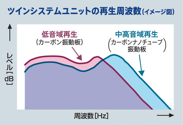 | 業界初!「ツインシステムユニット」 中高域用、低域用2つのダイナミック型ドライバーを並列配置し一体化した独自構造「ツインシステムユニット」を採用。上のグラフのように、中高域、低域、それぞれのユニットの再生帯域をあえて重ねることにより、中低域に厚みを持たせた高密度サウンドを達成している |