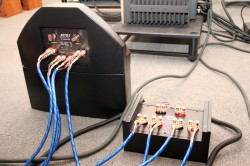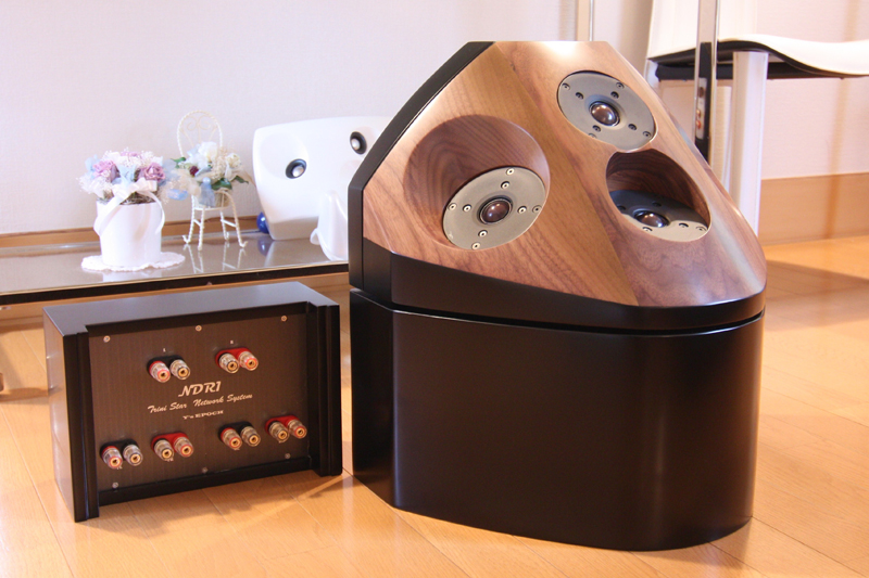 左右上下独立の4個のユニットはスキャンスピーク製。無秩序にあちこちを向いているように見えるかも知れないが、その方向と位置の精度は研究につぐ研究の結果たどりついたものだ。左右は4kHz、前後は10kHz以上で放射音のトリニスター効果(音場創成効果)が出るような設計。これを収めたエンクロージャーは60mm厚のウォルナットとホワイトアッシュの無垢削り出しを効果的に組み合わせたリアルウッドで、精度と剛性を高める専用台がオプションで用意されている。ネットワークはパーツにこだわり外付けとした。本体と外付けネットワークの間は、付属のZonotone製特注ケーブルでつなぐ。広い部屋やハイエンドスピーカーに対応する完璧な仕様である。