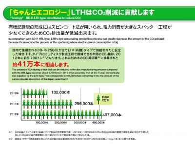 仮に、国内で使用されるBD‐R(25GB)が全てLTHタイプで供給されたと仮定すると、ディスク製造工程で削減できる年間のCO2量は、2012年に約5700トンくらいになると推定しており、杉の木のCO2吸収量に換算すると、約41万本に相当するという。