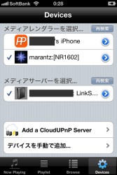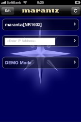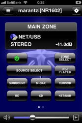 操作に使っているのは、これも最近手に入れた「iPhone 4S」です。マランツ純正のアプリ「Wizz App」をApp Storeでダウンロードし、アプリを起動すると、NR1602が認識されているので、これを選択。するとリモコンのボタンが並び、ボリュームの操作やセレクターの切り替えなどができます。たまにリモコンが見あたらなくなって慌てることがある私には嬉しい機能です。