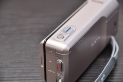 ボディは正面から見るとタテ型で、左サイドはモニター部分に凹ませた部分をヘアラインで仕上げるなど、シンプルさの中にもアクセントを感じさせるデザインだ。操作スイッチは必要最低限なものにとどめられ、通常よく使いそうなスイッチのみをハードキーとして用意、使い勝手も良い。ただ、留意すべきはレンズの開閉レバーで、撮影する時は自動的に開くものの、電源を切った時は手動で閉める仕様だ。