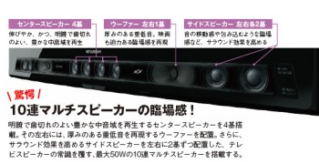 同社が長年にわたって培ってきたDIATONEの高音質技術を背景に、業界初となるカーボンナノチューブを使用した「DIATONE NCVスピーカー」により高音質を実現。同スピーカーをセンターに4個と左右に各2個。また、サブウーファーも2個備えた10連マルチスピーカーを搭載し、現在のテレビスピーカーの常識を覆す、合計50Wの大出力を併せて実現した。