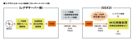 大まかな流れは、(1)BD/DVD/地デジなどといったソース情報と原画解像度情報、EPGによる情報がサーバー側(DBR-M190など)からHDMIケーブルを経由して55X3に伝達。(2)55X3は受け取った情報に応じて超解像処理を制御し、ディスプレイに表示する、というものだ。