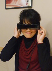 人間はものを見る際に、ほとんど視野の中心部で見ているらしいのですが、夜道で映像を再生しながら歩いていると、日中よりもずっと映像が“強く”見えるのです。グラス装着時は視界の中心部に画像が再生されているため、相対的に外の様子が確認しづらくなり、シースルーの効果が弱まるという現象です。もし前方を確認しようとするならば、頭を上に向け視線を下にして、グラスの下の部分から覗くようにしないと、前方をしっかりと見る事ができません。