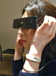 持ち運び時の使い勝手については色々と考慮されていて、本体とグラスとをつなぐケーブルの途中には「ミュートボタン」が搭載されています。ボタンを押すとすぐに映像と音声をミュートできるようになっています。ただ、ボタンを押しても、その間に映像の再生は進んでしまいます。このミュートボタンに機能を加えて、ポータブルオーディオプレーヤーのボリューム調整と同じように、映像の明るさを調節できるようにして、外の様子が見やすくなるような使い方ができれば良いと思います。