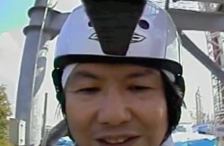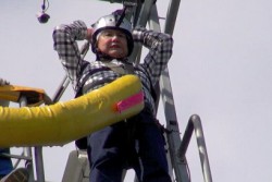 一番上に来るとかなり精神的に追い込まれる。何せ高さは22メートル、7階建てのビルと同じくらいなのだ。ここまで来て帰るわけにもいかないので、ジャンプ台に向かうしかなかった。ジャンプの説明員がロープの金具をセットし、ジャンプの説明をしてくれる。