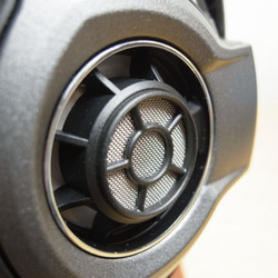 特に顕著なのは、開放型ヘッドホンの外装の醍醐味とも言えるハウジング背面の開口部分だ。このあたりはまさにHD800と同じ。一見すると中央部のみが開口されているが、実はその周囲の三分割された銀色の部分も極めて目の細かいメッシュとなっており、素材は薄い金属で、精密に加工されている。