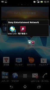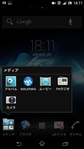 ホームメニューに配置された「メディア」のフォルダ内に、「Xperia SX」のオリジナルアプリである「アルバム」(写真アプリ)、「WALKMAN」「FMラジオ」などを用意しているほか、「Sony Entertainment」アプリのアイコンが存在。スクリーンを右に1枚めくると各種アプリのウィジェットが配置されている程度で、デフォルトのままでも邪魔になるものがなく、非常に扱いやすい。
