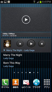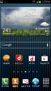 実際にGALAXY S IIIの電源を入れてみたところ、ホーム画面はドコモ端末共通の「docomo Palette UI」となっていたが、今回はサムスン独自の「TouchWiz home」に切り替えて使用した。ホーム画面にはトップに天気予報と時計を一体化したウィジェットに、「dメニュー」「dマーケット」などドコモ系のアイコンが並ぶ。トップメニューは有機ELの鮮やかな発色もあり、遠目にも目を惹くことは間違いない。AVファンにとっては、右に1面めくった画面に「動画」「音楽」のウィジェットが配置されておりアクセスしやすいほか、2面右には「S Suggest」というサムスン独自のアプリ連携ウィジェットが配置されている。