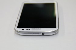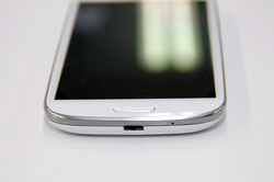 GALAXY S IIIを手にしてまず気付くのは、4.8インチHD SUPER AMOLEDディスプレイの発色の良さ、71W×137H×9.0Dmmという薄型かつ大柄なサイズ感、そして狭ベゼルなデザインから来るディスプレイの存在感にある。「ホーム」ボタンはハードウェアボタンで、「メニュー」「戻る」各ボタンもタッチセンサーで本体下方に配置されているのだが、それでも巨大な画面とフレームといった印象を受けるほど、画面に注目が集まるデザインだ。本体の端子類は上部にヘッドフォン端子、右側に電源、左側にボリュームボタンを配置。真下にはMicroUSB端子を搭載し、MHL出力対応のHDMIも用意。なお、本機は防水ではないので背面カバーも開けやすい構造になっている。