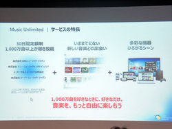 「Music Unlimited」は、月額1,480円(税込)で約1,000万曲の音楽を聴き放題というサービス。配信コーデックとビットレートはHE-AACの48kbps。「モバイル環境でもダウンロードなどが快適にできるように配慮した」「エンジニアなどが試聴して、お客様にも一定のご満足をいただけるレベルだと判断した」という。