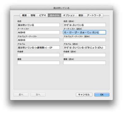 まず絶対に補充すべきなのは「よみがな」だ。これを入力しておかないと、例えば漢字表記のアーティストがライブラリで50音順に並んでくれない。それは不便だし美しくない。せめてアーティスト名のよみがなだけは入力しておきたい。