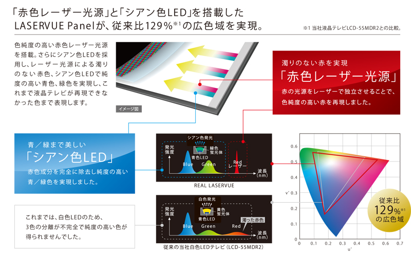 従来のテレビ※の表現力を遙かに超えたテレビがある。それが三菱「REAL LASERVUE」LCD-55LSR3。赤色レーザー光源搭載によって獲得した「高画質」だけでなく、音質や操作性にまで踏み込んで総合力を上げた製品なのだ。