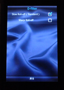 「D-filter」では、DACのデジタルフィルターのタイプを設定できる。「Slow Roll-off」「Sharp Roll-off」の2種類からの選択だ。