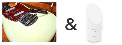 この調子で次に行こう。どうも木材製のものが好感触だということで、エレクトリックギターを寝かせてそのボディの上に設置してみた。するとソリッドで厚い木材の効果か、ベースラインがぐっと引き締まって明確になったのだ。これはかなりよい!