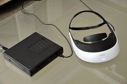 まず基本的なプロフィールを見ていこう。製品の構成としてはHMZ-T1とT2は変わらない。頭に装着し、映像を表示するヘッドマウントユニット部と、映像・音声入力や処理などを担当するプロセッサーユニット部に分かれており、そのあいだを1本のケーブルで結んでいる。