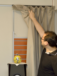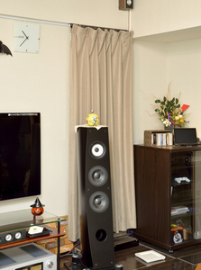 粟飯原さんは、主に吸音のためにスピーカーの後ろにカーテンを吊すなど、既に自ら音質対策に工夫を凝らしている。しかしこのカーテンの効果について訊ねてみると、「高音については、多少は良くなったかな、という印象なのですが、正直まだ不満があります。でも自分ではどこがどう悪いのかはわからなくて…」と首をひねった。