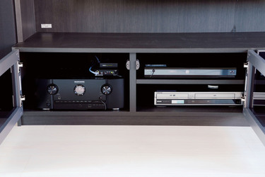 ホームシアターの計画が出た段階で、レイアウトは決まっており、パナソニックの壁面収納「キュビオス」を使うことが決まっていた。そこで、松尾氏は空間の美しさと使い勝手とクオリティを兼備するホームシアターを提案した。開放的な空間の印象を活かすため、機材や配線はすべて隠し、iPadで機器をすべて操作できるようにするなど、ゲストを驚かせる演出にもこだわった。