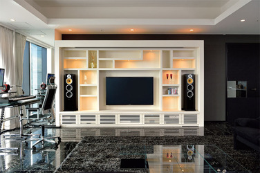 ホームシアターは130インチの大スクリーンに5.1chという構成。Aさんが特に重視したのは「デザイン」と「オートメーション」。美しい壁面収納は世界にひとつのオリジナル仕様。配線がまったく見えないように、また機器がピッタリと納められるように設計されている。収納棚はシンメトリーではなく、形状がランダムで、演出用のスポットライトを配置するなど、遊び心が詰まったデザインである。