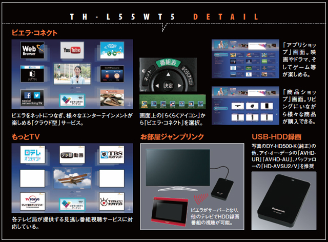 ビエラはDLNA規格に対する取り組みも早かった。このWT5はWi‐Fi子機を内蔵し、ケーブルレスで接続できるだけでなく、USB‐HDD内の番組を別室のビエラへ転送できるサーバー機能も兼ね備えている(お部屋ジャンプリンク)。クラウドサービスへの着目でも他をリード。「ビエラ・コネクト」で利用できる映像アプリは現在54に達している。さらに注目されるのは、民放5社及び電通が運営するVODサービス「もっとTV」に業界初対応していることである。リモコン上に専用ボタンが設けられワンプッシュで該当放送局の番組一覧が表示される。さらにスマホ連携も強化されており、専用アプリをダウンロードすれば、Wi‐Fiを通じ、スマホを本機のリモコンとして使用できるだけでなく、スマホ内の動画や画像、音楽を本機で再生可能となる。