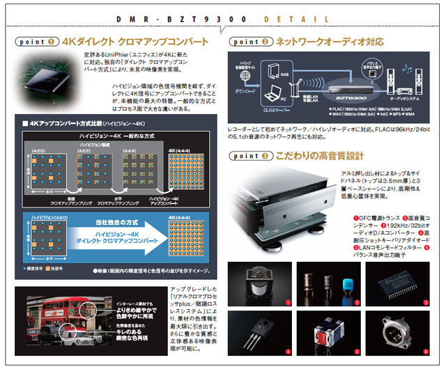 画質面では次世代4Kディスプレイとの接続を視野に入れた4Kアップコンバート機能を搭載したことが新しい。これは本機だけの限定仕様で、DIGAシリーズの他の製品には搭載されていない。